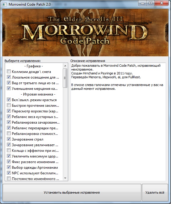 Morrowind Code Patch: Морроувинд - игра с огромным, детально прописанным и интересным миром. Её модостроителный потенциал огромен, а сообщество поклонников большое и преуспевающее. К сожалению, игра полна багов. Этот патч - наша попытка победить худшие из них, включая порчу сохранённых игр, заключённых в коде игры. А также мы попытались добавить несколько новых функций, о которых давно мечтали преданные фанаты.