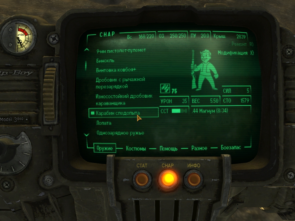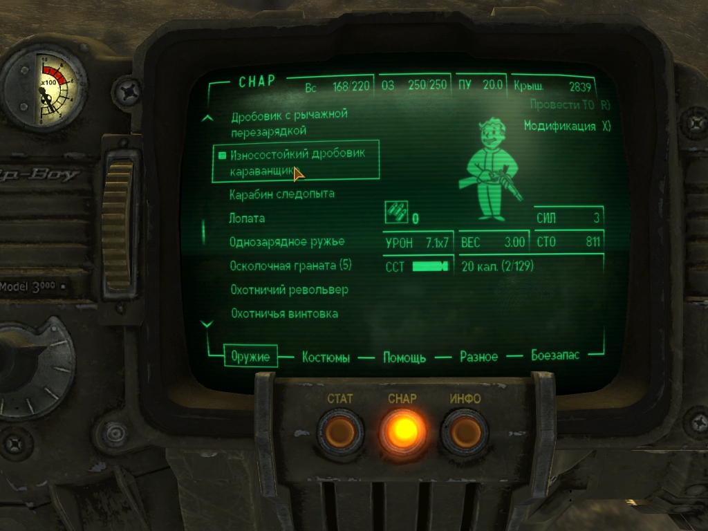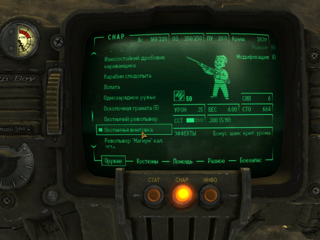 dimast95 Опубликовано 13 декабря, 2015 Жалоба Поделиться Опубликовано 13 декабря, 2015 (изменено) Всем Ку! Имеется следующая проблема: урон у некотого оружия в Пип-Бое при взятии его в руки уменьшается, а у некоторого увеличивается.У меня есть 4 оружия:- дробовик с рычажной перезарядкой (урон 4.8х7)- износостойкий дробовик караванщика (урон 6.0х7)- карабин следопыта (урон 41)- охотничья винтовка (урон 42)У первых двух при взятии в руки урон увеличивается до 5.7х7 и 7.1х7 соответственно, а у последних двух уменьшается до 35.Это баг, или так и надо? Если баг, то как исправить? А то в прошлое прохождение я такого не замечал.Версия игры Ultimate. Изменено 13 декабря, 2015 пользователем dimast95 Ссылка на комментарий Поделиться на другие сайты Поделиться