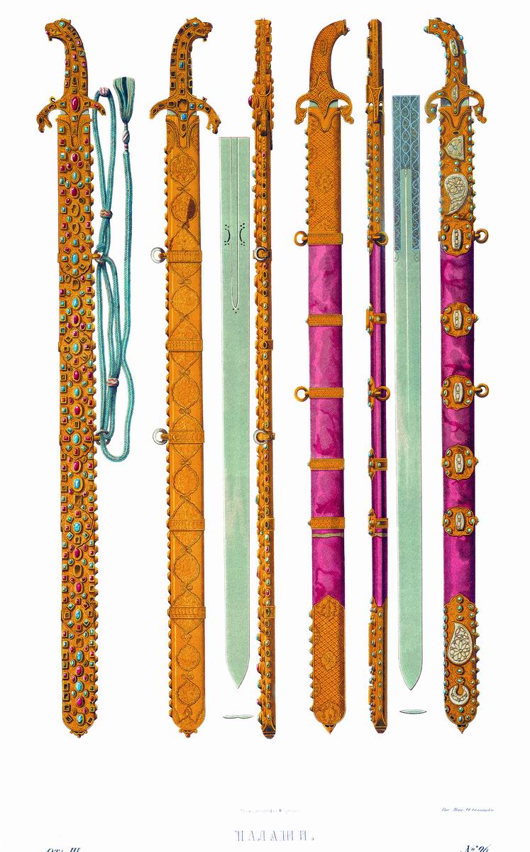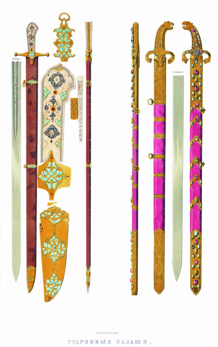 Насчет "палашей" - вариантов немного: по способу применения это, судя по всему, морровиндский аналог фальшионов - тяжелых рубящих клинков. Правда, в Морровинде почему-то часто встречаются такие как мечи с двусторонней заточка клинка, так и мечи, почти ничем не отличающихся от обычного меча.