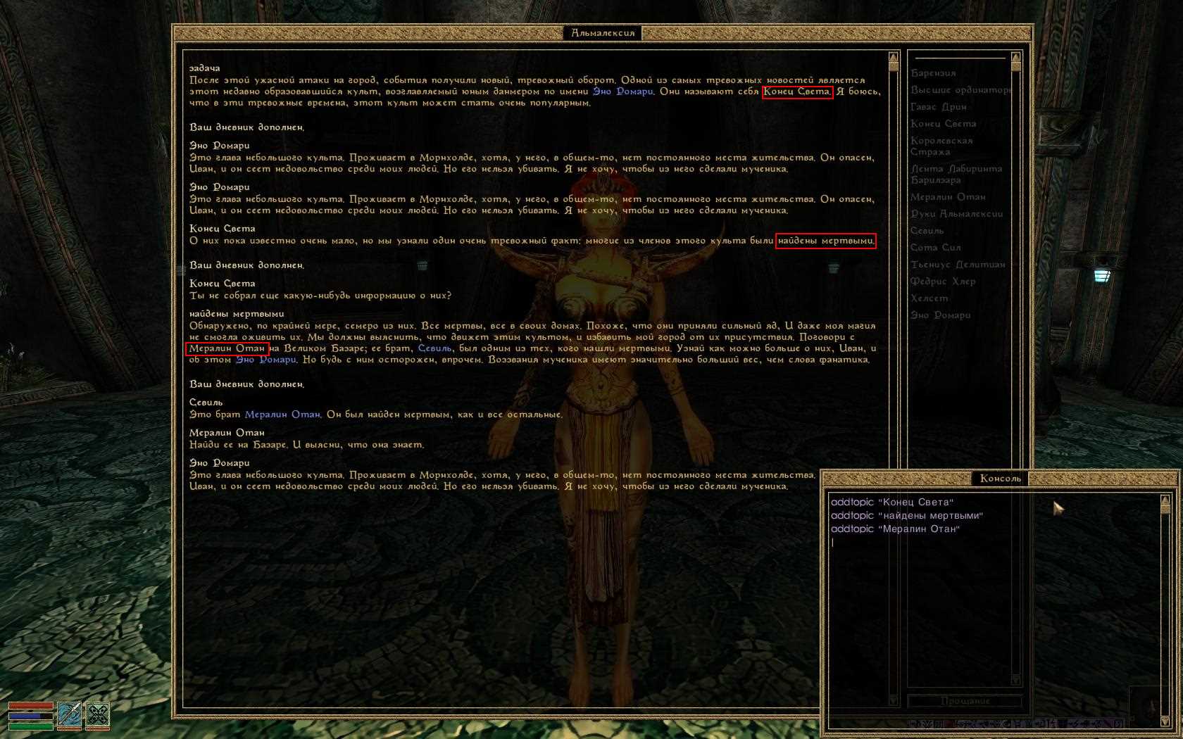 RunningWithScissors Опубликовано 21 октября, 2018 Жалоба Поделиться Опубликовано 21 октября, 2018 (изменено) Квест дополнения Трибунал "Демонстрация силы" невозможно пройти без консоли. Пришлось добавлять топики к Альмалексии. P.S. По этому же кв. Не понятно, какую погоду включает машина. Включал наугад, пока не появилась запись в дневнике, что в Морнхолде будут пепельные бури. Что-то не так с текстурой? И рядом с погодной машиной слишком громкий звук водопада. Изменено 21 октября, 2018 пользователем RunningWithScissors Ссылка на комментарий Поделиться на другие сайты Поделиться