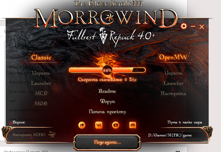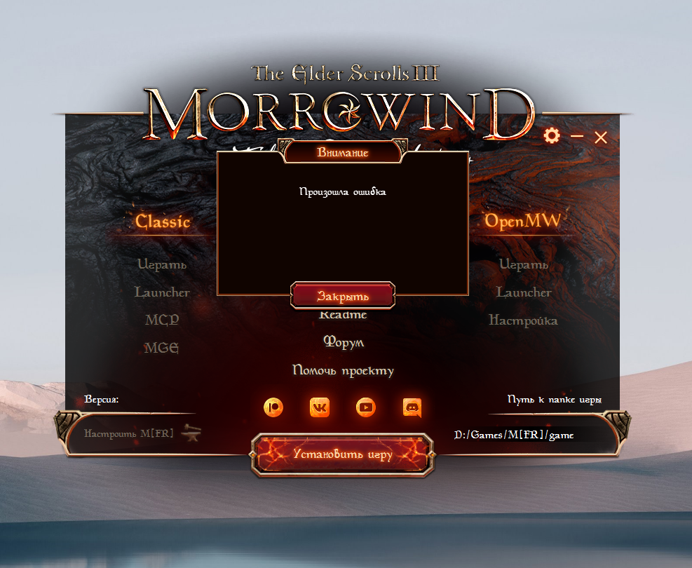 Марк К. Марцелл Опубликовано 24 июня, 2021 Жалоба Поделиться Опубликовано 24 июня, 2021 Здесь обсуждаем установщик и конфигуратор, собираем отчёты об ошибках. Если у вас проблемы на стадии скачивания, настройки, обновления, подключения опций - то есть ещё до начала игры - пишите в этой теме. Формат отчёта: 1. Описание проблемы (со всеми необходимыми подробностями) 2. Скриншот или видео (если требуется) 3. Какой лаунчер, откуда скачан (обязательно!) 4. Точная версия M[FR] (обязательно!) 5. Операционная система (обязательно!) 6. Логи об ошибках (содержимое папки "logs") (обязательно!) FAQ/ЧАВО (часто задаваемые вопросы): Спойлер В: Пока каким путям нельзя устанавливать MFR? O: Нельзя, чтобы в пути установки были русские символы и нельзя устанавливать в C:\Program Files. В: При установке MFR не могу выбрать путь установки. O: У вас уже установлен MFR. Новая установка будет произведена по тому же пути. Для установки в другое место полностью удалите MFR. ИЛИ Инсталлятор находится по адресу, содержащему кириллицу. Для корректной установки и работы выберите путь без кириллических символов. В: Настройщик не запустился и не было никаких сообщений, либо выскочили другие ошибки. Что делать? O: Написать в эту тему. Содержимое папки MFR\logs нужно прикрепить к сообщению (если не прикрепляется - упаковать в архив), чтобы разработчик софта понял в чем дело и помог вам. В.: При запуске онлайн-инсталлятора или настройщика выдаёт ошибку: this application requires a java runtime environment 11. О.: Во-первых, убедитесь, что у вас 64-х разрядная операционная система. Во-вторых, переустановите репак - JRE 11 содержится в установщике (папка jdk). Если онлайн-инсталлятор / конфигуратор всё равно не работает (из-за 32-разрядной ОСи, технического сбоя или каприза богов), вы можете скачать оффлайн-установщик, установить репак, запустить игру (лежит в папке game) и настроить её вручную. В: После установки лаунчер не запустился, выбило ошибку Runtime Error! O: Конфигуратор сборки работает только на Windows 7 и выше, на Windows XP вы сможете поиграть только в оригинал через MGE XE, но настройщик и обновлятор сборки работать не будет. В: Почему конфигуратор не работает под Windows 98\XP? O: Потому что он написан на Java более поздней, чем 8 версия (последняя, поддерживавшая ХР). В.: При запуске MGE XE (или другой опции лаунчера) выскакивает предупреждение "Один или несколько файлов отсутствуют"; игра выдаёт кучу ошибок; после запуска на экране - множество жёлтых ромбов с восклицательными знаками. О.: Репак скачался/установился не полностью. Нужно перекачать/переустановить (из того же или другого источника). В.: При запуске лаунчера появляется лого, потом исчезает. Сам лаунчер не открывается. Открыть лаунчер нормально получается только после перезагрузки компа. О.: Это происходит потому, что лаунчер уже был запущен и свёрнут в трей. Откройте трей и дважды щёлкните по нужной иконке. Если не помогло, откройте диспетчер задач и завершите процесс javav.exe, после чего снова запустите лаунчер. В.: Каждый раз после перезапуска лаунчера MFR слетают настройки в MGE. О.: Запустить MGEXEgui из папки игры (\Morrowind\game), настроить и не запускать его в лаунчере. Настройки сохранятся и не будут сбрасываться. В.: Лаунчер не запускается. В диспетчере задач присутствует openjdk platform binary появляется. О.: Ошибка может возникнуть на 64-разрядной версии Java. Установите 32-разрядную (или х86 - это одно и то же). В.: Не запускается, ругается на 