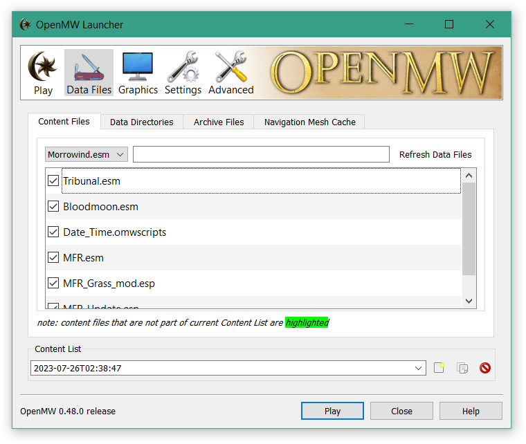 aL☢ Опубликовано 8 августа, 2023 Жалоба Поделиться Опубликовано 8 августа, 2023 В 05.08.2023 в 12:54 PM, Siompc сказал: Версия 4.1.20 beta Ребят, косяк с игрой. В общем запустил я лаунчер, решил перед игрой нажать "Настроить M[FR]". Просмотрел возможности и нажал "Закрыть" без сохранения настроек. Все. Теперь при запуске игры OpenMW сообщает что отсутствует MFR Grass mod ( на скрине видно ). Если нажимаю "Launcher", он вообще не видит директорию игры. Хотя путь к папке с игрой в лаунчере нормальный и игровые файлы там на месте. Проверку целостности делал Что обнаружил - в директории "Documents\My Games\OpenMW" в файлах "launcher.cfg" и "openmw.cfg" в строках заменилась буква диска "data=С:\Games\M[FR]\game\Data Files" исправил на "data=F:\Games\M[FR]\game\Data Files" и аналогично во втором файле. Теперь ошибка другая при запуске Обнаружил, что в лаунчере не выбраны контент файлы. Выбираем как на скриншоте и игра запускается 🙂 P.S. - но ошибку желательно поправить в будущем А ведь нужно было всего лишь просто перезапустить лаунчер, который при перезапуске восстанавливает побитые конфиги, которые по какой-либо причине побились. Баг в итоге так и не смог воспроизвести. Ссылка на комментарий Поделиться на другие сайты Поделиться