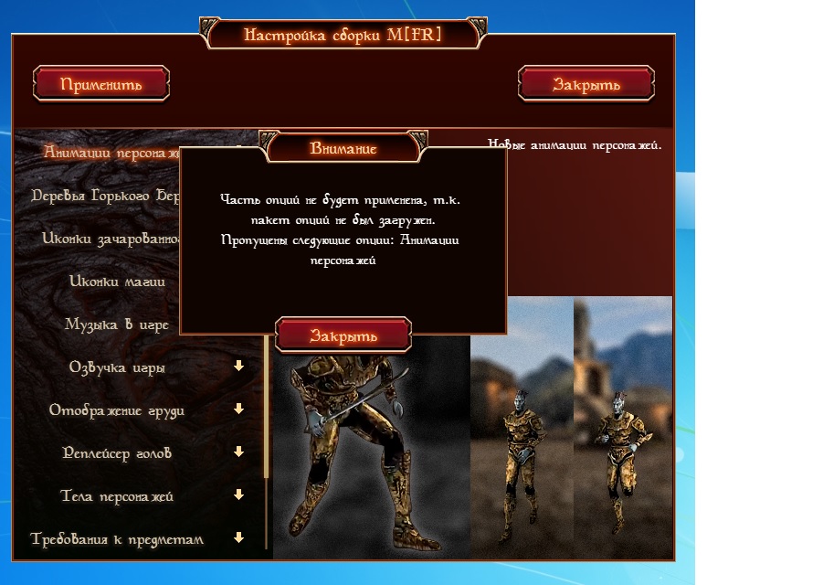<Не установился Тамриель ребилд, не установились нужные лица, не установилась новая анимация, не установилась опция по требованию к оружию и доспехам. Хотя всё это было правильно подключено в настройщике.