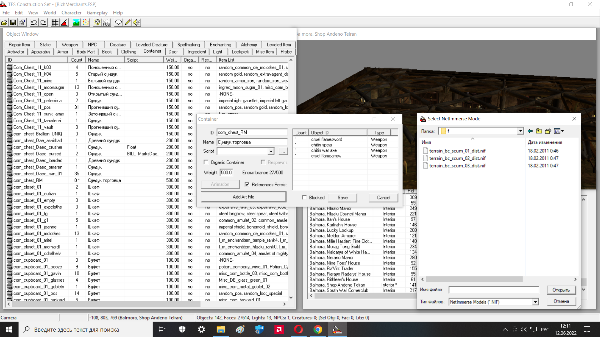Alex Vitean Опубликовано 12 июня, 2022 Жалоба Поделиться Опубликовано 12 июня, 2022 (изменено) Делаю мод на Construction Set для Морровинда. Проблема следующая. При добавлении сундука для торговца нужно выбрать меш объекта. А редактор в папке меш почему-то не видит. При этом все сундуки в игре есть, в игре все работает пока нормально. В чём может быть проблема и как это можно решить? Я имею ввиду опцию "Add art file". Может я не вполне точно описываю проблему. Просто сундук не хочет появляться на локации и появляется только если выбрать меш в этой опции. Ещё я заглянул в саму папку Meshes. Что-то число видимых файлов в трех подпапках очень небольшое. Так и должно быть или я её запорол? В игре вроде все объекты есть. Изменено 12 июня, 2022 пользователем Alex Vitean Ссылка на комментарий Поделиться на другие сайты Поделиться