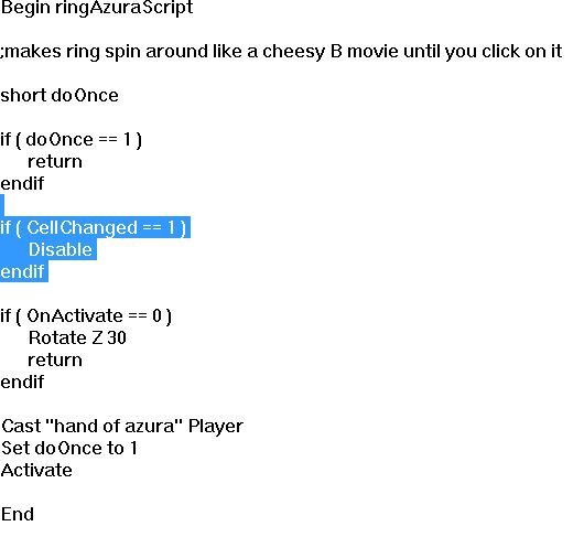 Мэд Макс Опубликовано 26 января, 2023 Жалоба Поделиться Опубликовано 26 января, 2023 Здравствуйте. Пытаюсь понять, как делают объекты, появляющиеся в игре только по достижении определенных условий. Есть активатор azura spirit. С ним понятно, к нему прикреплен скрипт AzuraEnd, в котором azura spirit отключается с помощью if ( GetJournalIndex C3_DestroyDagoth < 20 ) disable endif а включает его if ( GetJournalIndex C3_DestroyDagoth == 20 ) enable set state to 2 endif в том же скрипте. А вот с Кольцом Азуры (ring of azura) непонятно. Включается оно в том же AzuraEnd "ring of azura"->Enable но ведь перед этим оно как то должно было быть отключено (disable). В AzuraEnd этого не вижу В скрипте, прикрепленном к самому кольцу (ring of azura) отключения тоже нет, там только вращение. Где запрятано отключение ring of azura ? Ссылка на комментарий Поделиться на другие сайты Поделиться
