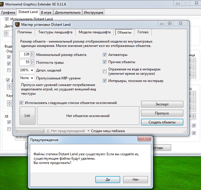 Fluorine Опубликовано 2 декабря, 2020 Жалоба Поделиться Опубликовано 2 декабря, 2020 (изменено) Трава была при первом запуске игры. После того, как я накатил несколько модов, получил вот это. Последний раз я играл в Морру 5 лет назад, тогда MGE и Дистанд Ленд были немного другие. Но это не важно, потому что я уже ничего не помню. Настройки программы из шапки темы неактуальны, а я не уверен, что все делаю правильно. Вот, тыкаю создание, тут трава есть. А дальше что делать? И подскажите, где искать параметр Fog Distance. Программа-то у меня на русском.Я припоминаю, что у меня не появлялась трава при самой первой настройке MGE, но потом я разобрался. Я точно что-то не то делаю. Изменено 2 декабря, 2020 пользователем Fluorine Ссылка на комментарий Поделиться на другие сайты Поделиться